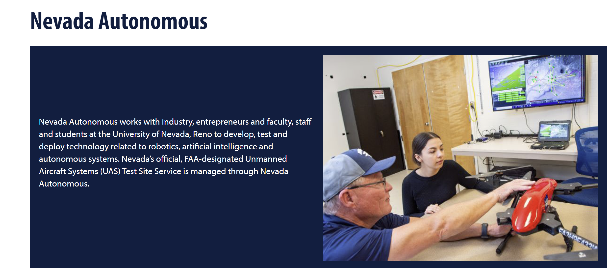 Nevada Autonomous: 네바다 UAS 테스트 사이트 활동을 주(州) 전역에서 총괄·운영하며, 시험 기회마다 안전을 중심으로 운영 역량과 노하우를 제공하는 조직(프로그램)으로 소개됐다.