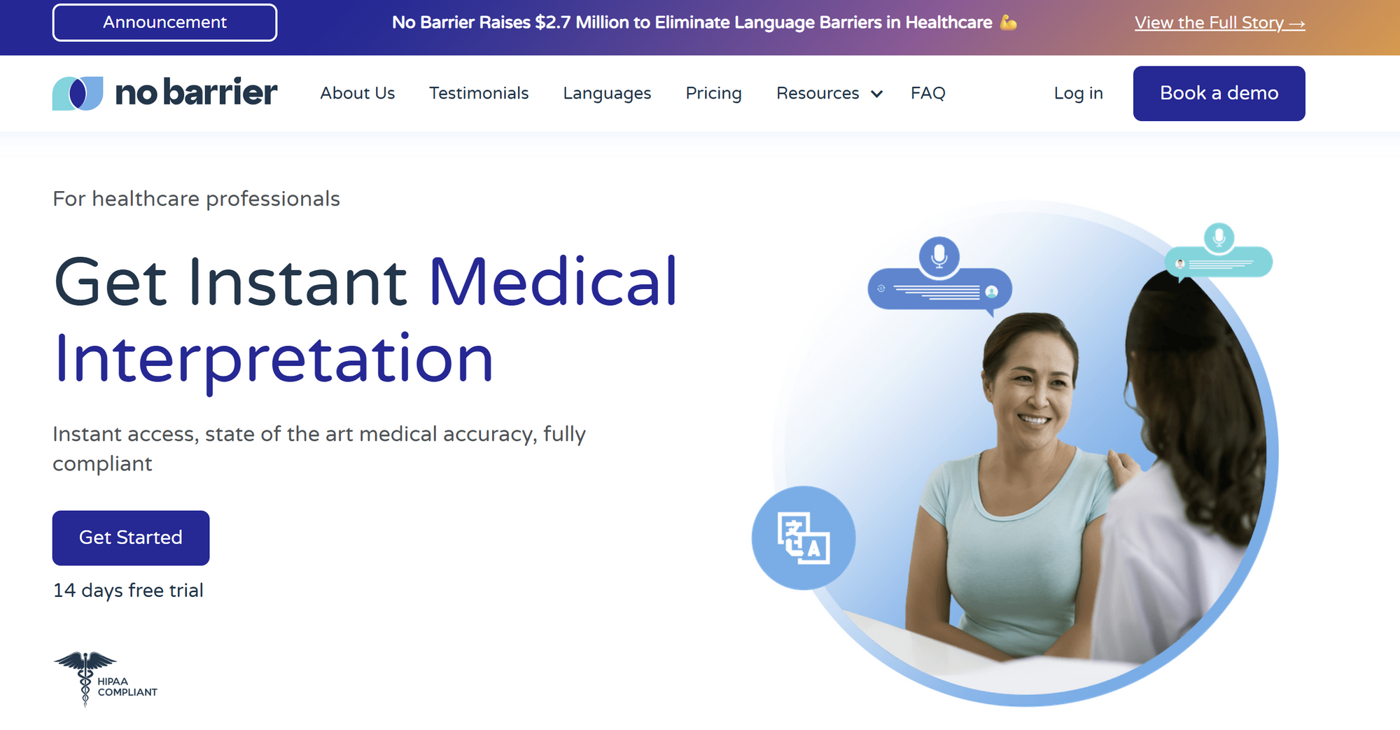 No Barrier aims to solve these challenges through AI technology. The company's platform is HIPAA-compliant and currently serves over 100 healthcare facilities across 12 U.S. states. It provides real-time interpretation in more than 40 languages, including Spanish, Mandarin Chinese, and Arabic.