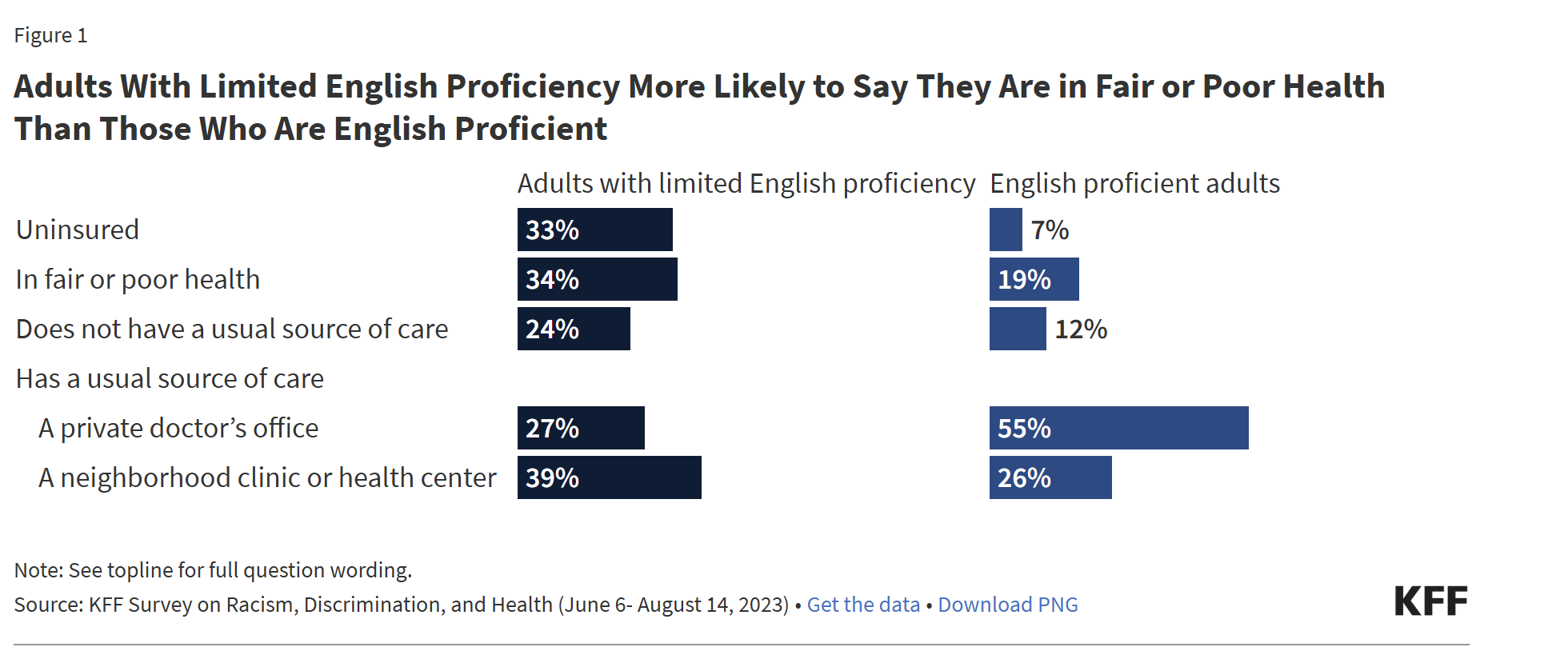 Approximately 26 million U.S. residents have limited English proficiency, representing roughly 8% of the total population. This demographic is particularly concentrated among Hispanic, Asian, and Middle Eastern immigrant communities. According to health research organization KFF, patients facing language barriers are significantly more likely to rate their physical health as "fair" or "poor" compared to English-proficient individuals.