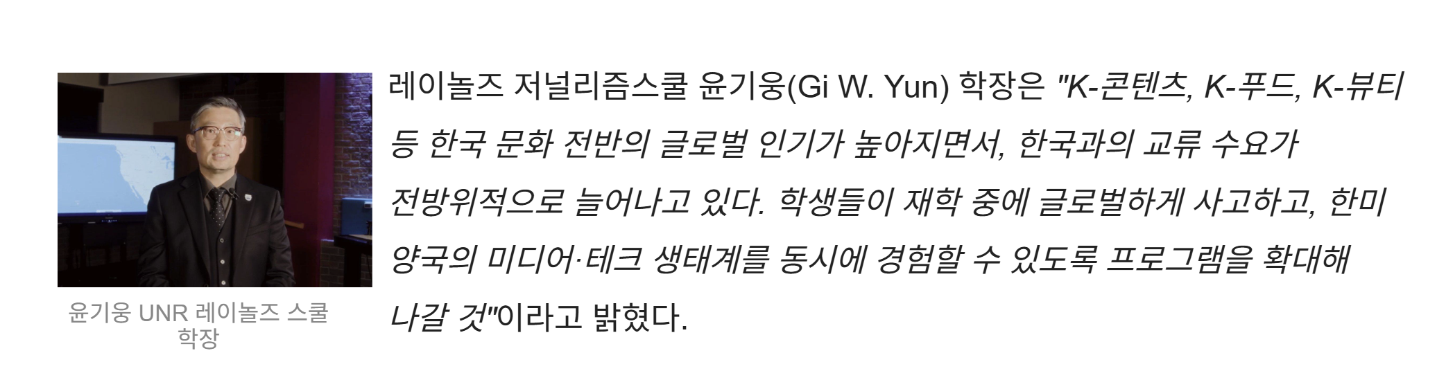 150년 역사 R1 등급 연구 중심 대학이자 테슬라·파나소닉 등이 밀집한 리노 지역의 AI·테크 산업 인프라를 갖춘 UNR과의 협업은, 한국 대학 재학생에게 학점 취득, 산업 현장 체험, 글로벌 네트워크 구축을 동시에 제공할 수 있다는 점에서 의미가 크다.