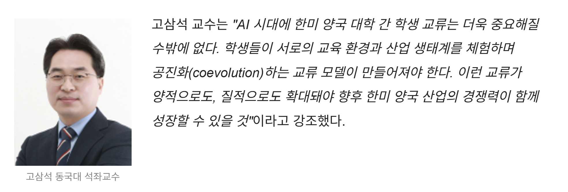 한미 대학 교류 확대에 대한 관심은 학계·정책 전문가 사이에서도 높아지고 있다. 고삼석(Ko Sam-seok) 동국대학교 석좌교수(전 방송통신위원회 상임위원, 대통령 직속 AI위원회 위원)는 지난 1월 CES 참관을 마친 뒤 UNR 경영대학(College of Business) 산하 오즈멘 기업가센터(Ozmen Center for Entrepreneurship)를 방문했다. 이 자리에서 고 교수는 한미 학생 교류 확대 방안과 함께, 한국 기업의 글로벌 진출을 지원하는 컨설팅 프로그램 운영에 대해 논의한 것으로 알려졌다.